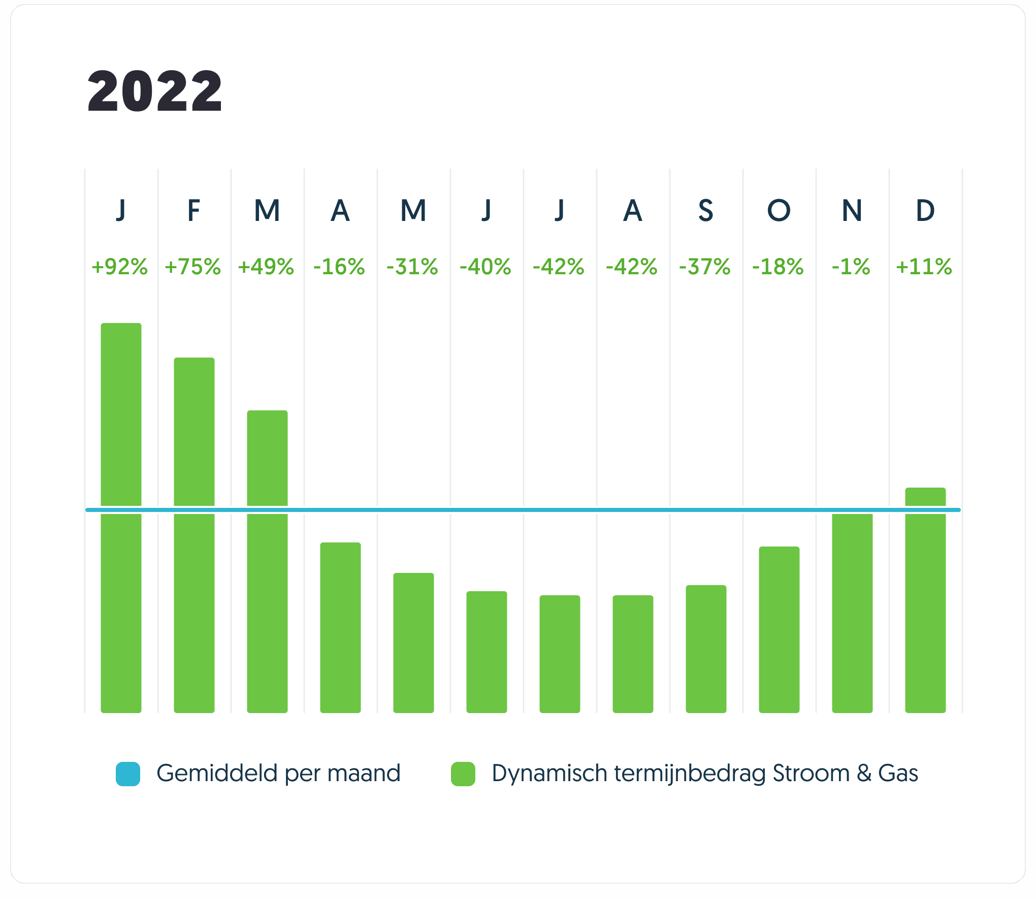 De grafiek geeft een indicatie van de verschillen in maandelijkse voorschotten (peildatum 17 november 2021) ten opzichte van de gemiddelde maandelijkse kosten bij Frank in 2022. Dus de inschatting van je termijnbedrag voor januari is 92% hoger dan je gemiddelde maandelijkse kosten, de inschatting voor je termijnbedrag in augustus is 42% lager.